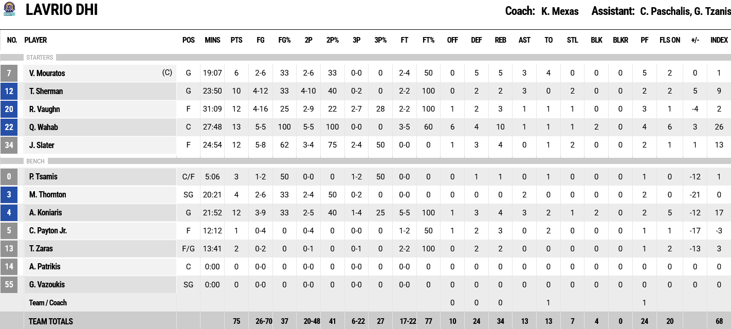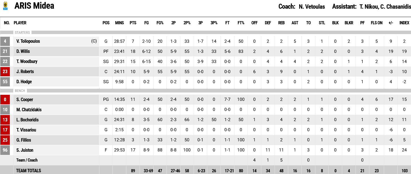 Ξεχώρισαν: Από τον Άρη είχε double double ο Τζούστον με 17 πόντους και 11 ριμπάουντ. Από το Λαύριο είχε ο Γουάχαμπ double double με 13 πόντους και 10 ριμπάουντ, ενώ ο Κόνιαρης, ο Σλέιτερ και ο Βον έβαλαν από 12 πόντους έκαστος.