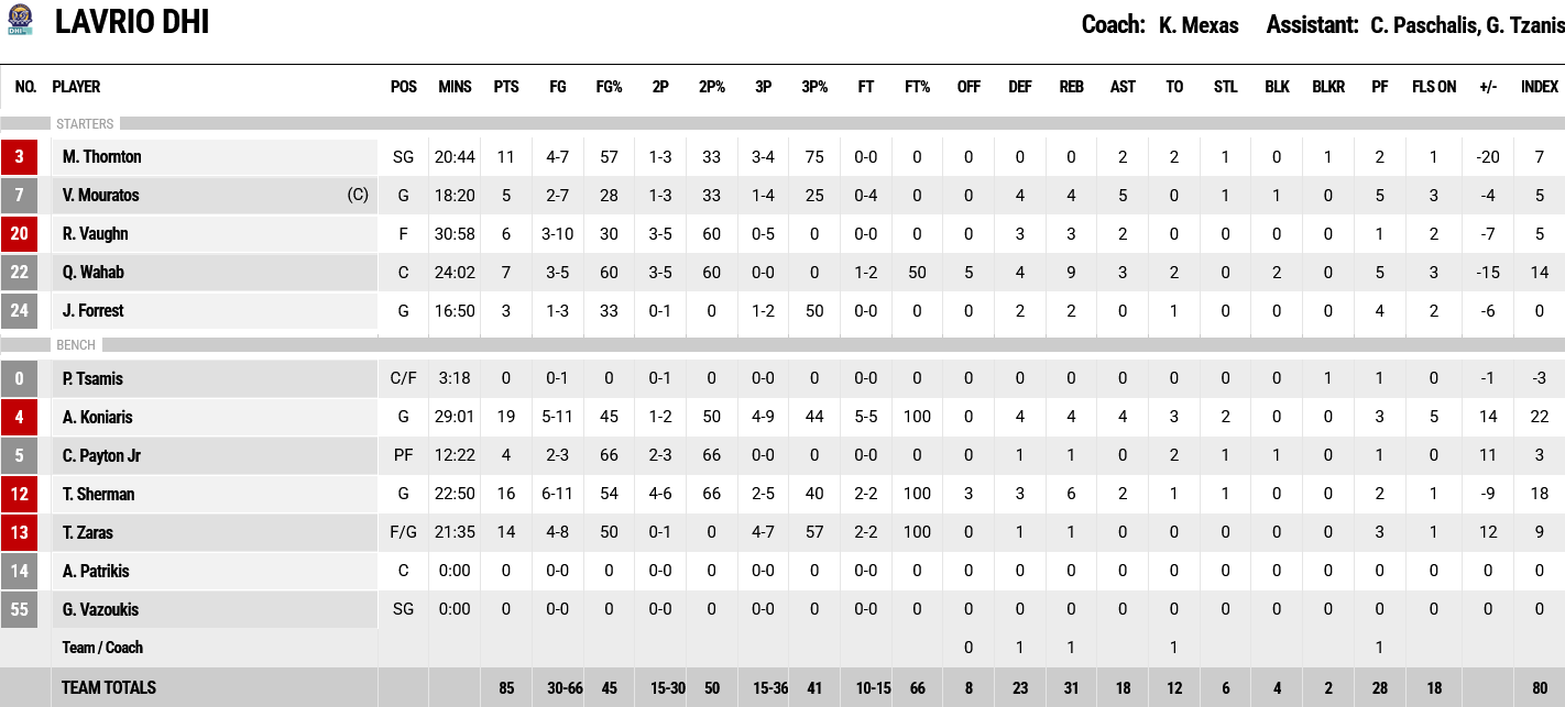 Ξεχώρισαν: Εξαιρετικός ο Νικολαΐδης με 16 πόντους και οκτώ ριμπάουντ, ενώ για το Λαύριο, ο Κόνιαρης είχε 19 πόντους και ο Σέρμαν 16.