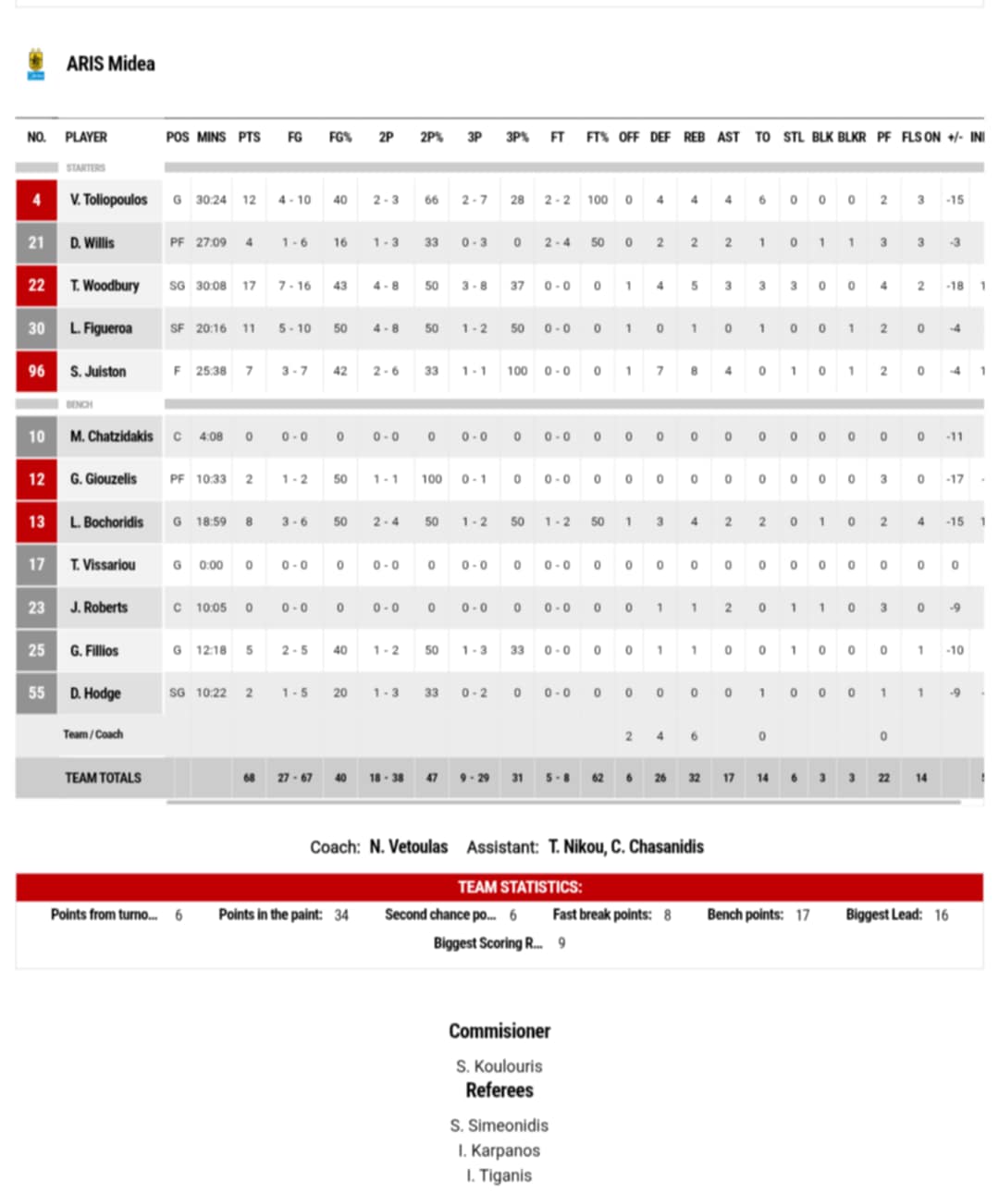 Ξεχώρισαν: Από τον Μαρούσι σκόραραν ο Τανούλης και ο Ρέινολντς με 20 και 17 πόντους αντίστοιχα. Από τον Άρη διακρίθηκαν οι Γούντμπερι και Τολιόπουλο με 17 και 12 πόντους.