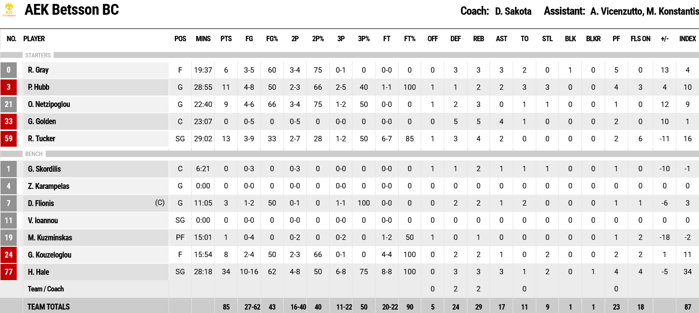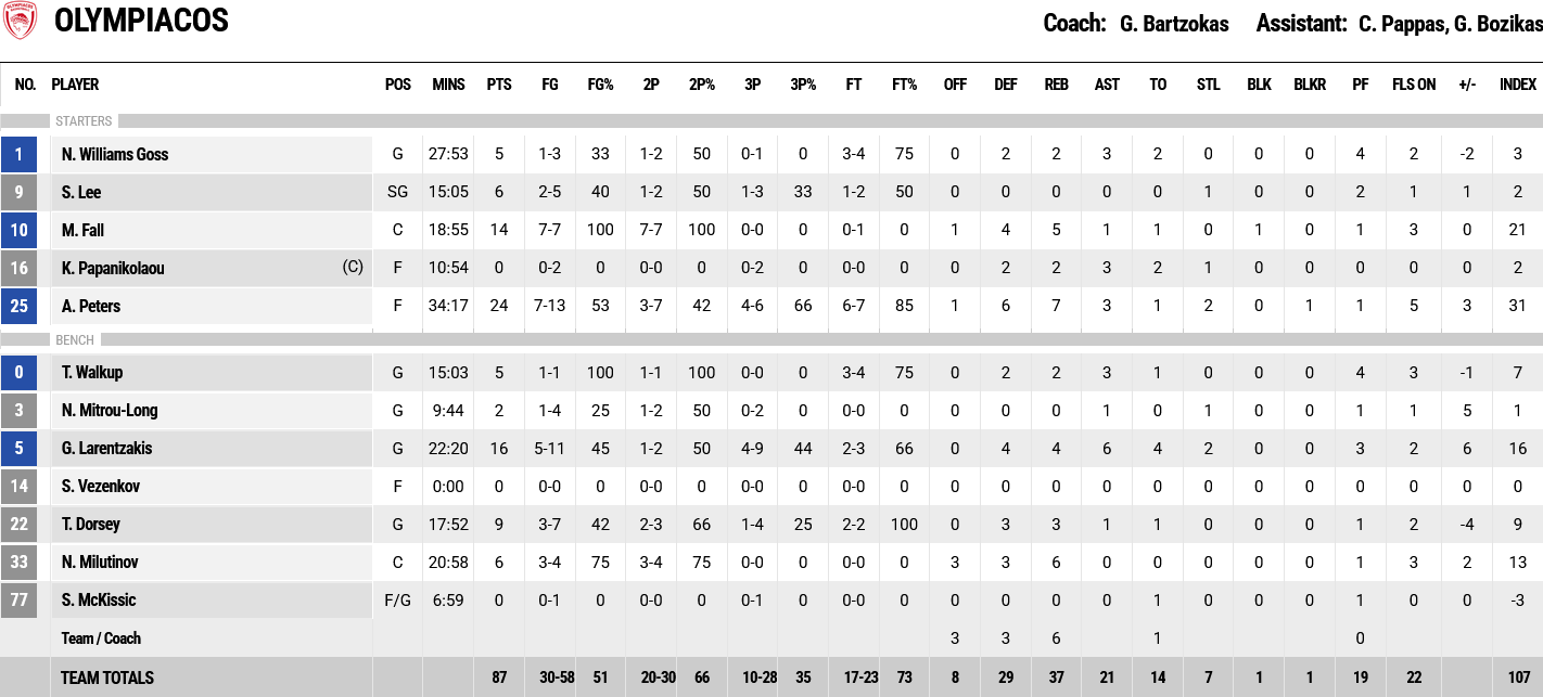 Ξεχώρισαν: Εξαιρετικός ο Πίτερς με 24 πόντους, επτά ριμπάουντ και τρεις ασίστ, άρπαξε την ευκαιρία ο Λαρεντζάκης με 16 πόντους, τέσσερα ριμπάουντ και έξι ασίστ, ενώ 14 πόντους είχε ο Φαλ. Για την ΑΕΚ, εκτός του… δαιμονισμένου Χέιλ, ο Τάκερ έιχε 13 πόντους, όμως και το άστοχο λέι απ στο φινάλε, ενώ ο Χαμπ είχε 11 πόντους.