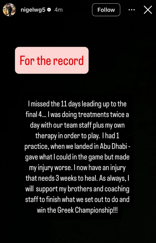 “Έχασα τις 11 ημέρες στον δρόμο προς το Final Four, έκανα διπλές θεραπείες καθημερινά με την ομάδα αλλά και δική μου έξτρα θεραπεία με στόχο να αγωνιστώ. Έκανα μια προπόνηση, όταν προσγειωθήκαμε στο Άμπου Ντάμπι, έδωσα όσα μπορούσα, αλλά επιδείνωσα τον τραυματισμό μου. Τώρα αντιμετωπίζω έναν τραυματισμό που χρειάζεται τρεις εβδομάδες για να αναρρώσω. Όπως πάντα, θα υποστηρίξω τα αδέρφια μου και το προπονητικό τιμ για να τελειώσουμε τη δουλειά και να κατακτήσουμε το ελληνικό πρωτάθλημα”.