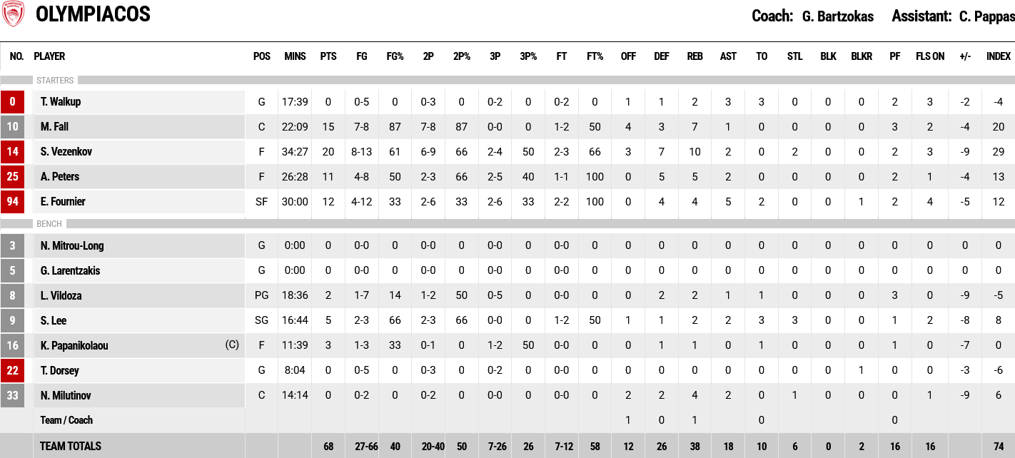 Ξεχώρισαν: Γκραντ με 17 πόντους, Ναν με 14 πόντους και έξι ασίστ, αλλά και Γιούρτσεβεν, με 12 πόντους και επτά ριμπάουντ, ήταν οι κορυφαίοι του Παναθηναϊκού. Από πλευράς Ολυμπιακού, εκτός του Βεζένκοβ, ξεχώρισε ο Φαλ με 15 πόντους και επτά ριμπάουντ, ενώ Φουρνιέ και Πίτερς είχαν 12 και 11 πόντους αντίστοιχα.