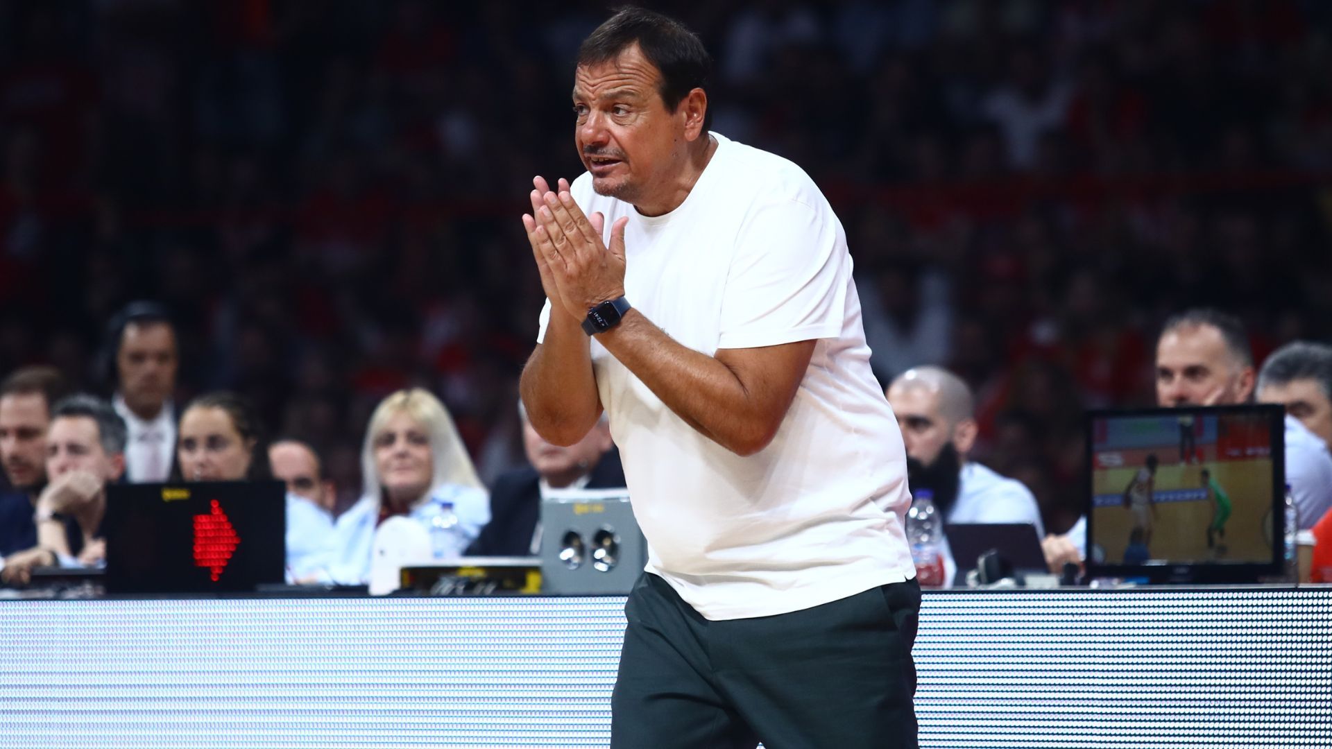 Ή ίσως για τον Παναθηναϊκό έχουν δικαίωμα να το πουν. Για την Τουρκία όμως δεν μπορεί να το πει κανείς αυτό. Αυτό είναι το πρώτο πράγμα. Παίρνω τη δεύτερη τεχνική ποινή για αυτό. Και αυτά τα πράγματα που έγιναν στην αρχή του ματς… Όλα αυτά που έκαναν για την οικογένεια του προέδρου του Παναθηναϊκού, του Γιαννακόπουλου, όλα αυτά δεν υπάρχουν στον αθλητισμό. Είναι μπάσταρδοι. Αυτοί που έκαναν όλα αυτά είναι μπάσταρδοι. Αυτό είναι όλο. Και φυσικά οι διαιτητές έδωσαν 33 βολές στον Ολυμπιακό, φυσικά παίζουμε aggressive και σε ποιον δίνουν 33 βολές; Στον Ολυμπιακό. Αλλά οκ, η σειρά συνεχίζεται στο ΟΑΚΑ”.