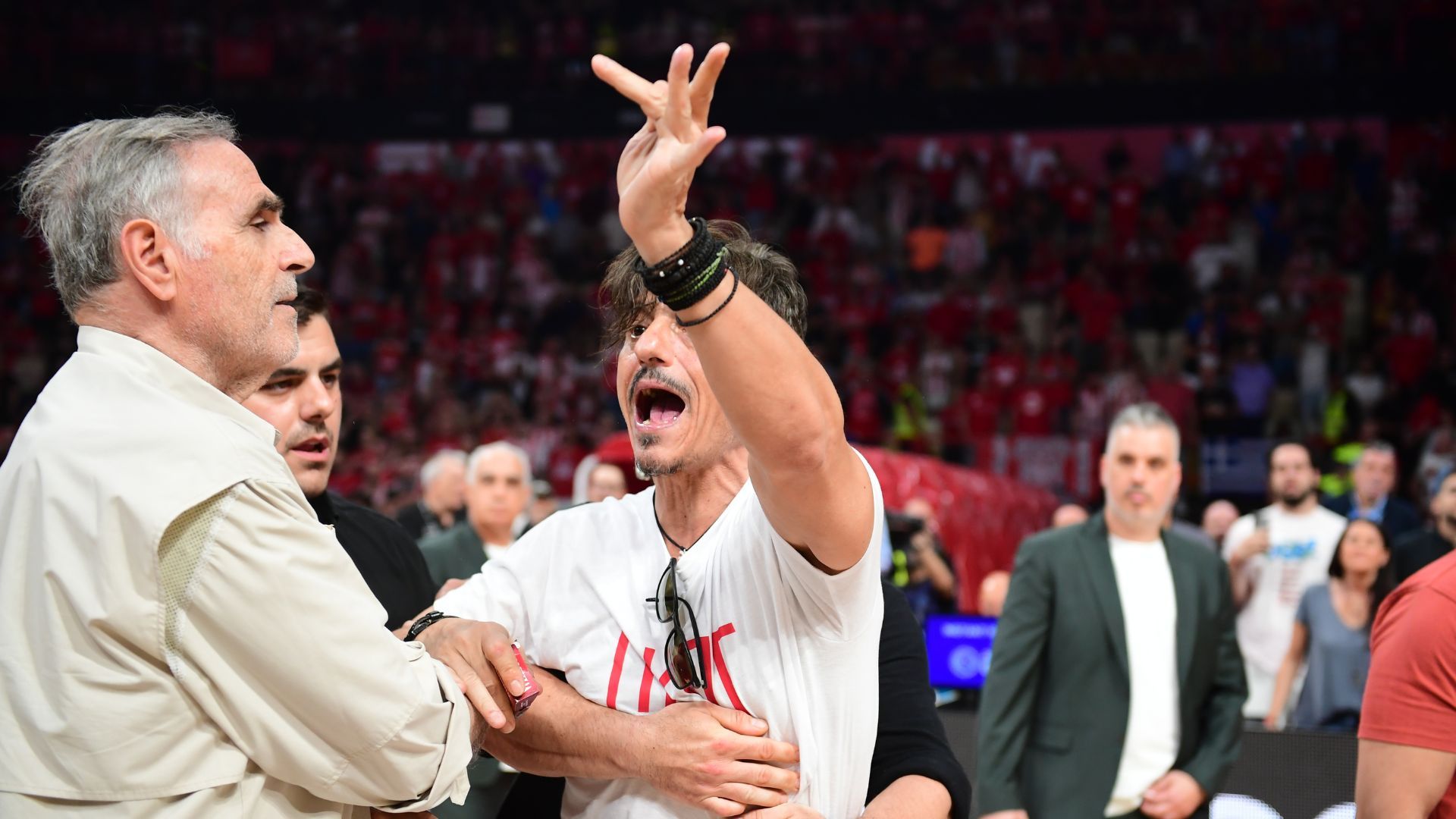 Την προκλητική του συμπεριφορά από την ώρα που εισήλθε στο παρκέ, αλλά και τις απειλές του με αποδέκτη τον Πρόεδρο της ΚΑΕ Ολυμπιακός, κ. Γιώργο Αγγελόπουλο, με αναφορά σε γενετήσια πράξη που αφορά ανήλικο μέλος της οικογένειάς του και πιο συγκεκριμένα την κόρη του.
