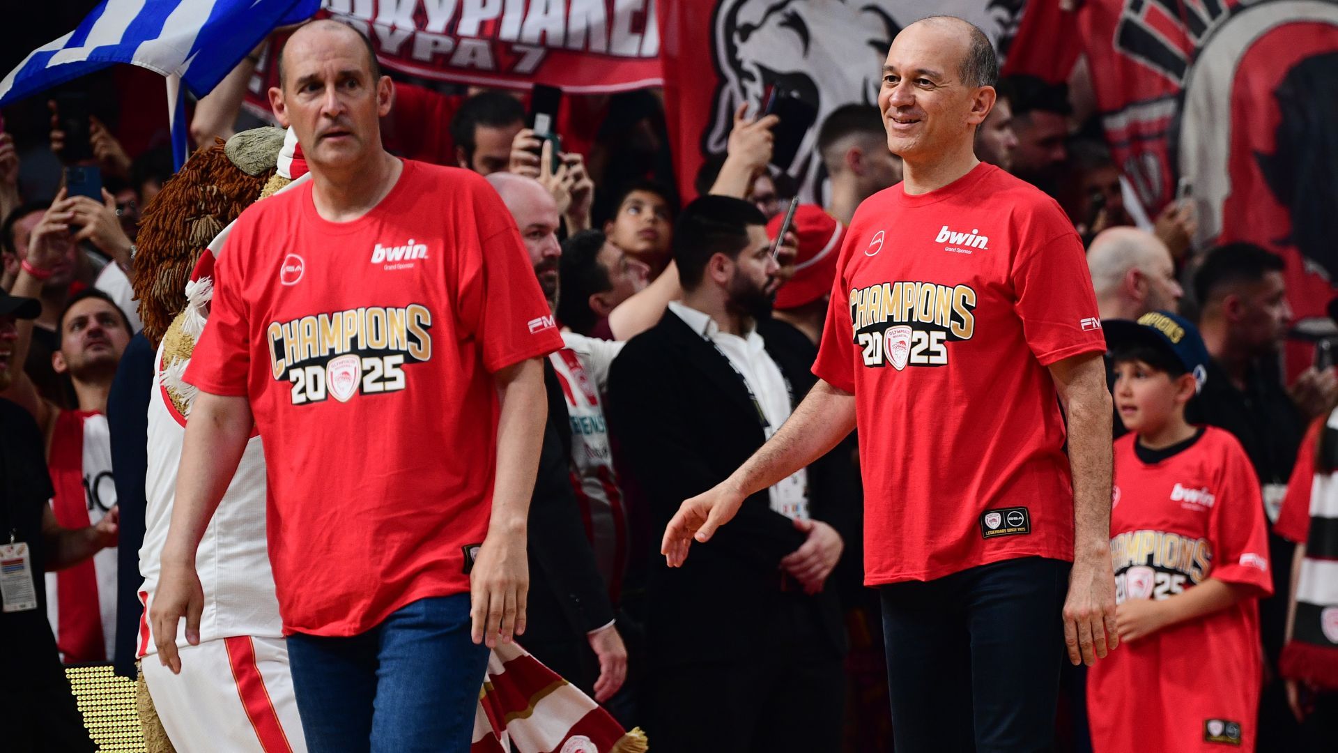 Μετά τη λήξη της αναμέτρησης, οι ιδιοκτήτες της ΚΑΕ Ολυμπιακός, Παναγιώτης και Γιωργος Αγγελόπουλος, μίλησαν στους παίκτες της ομάδας τους, τους οποίους και αποθέωσαν.