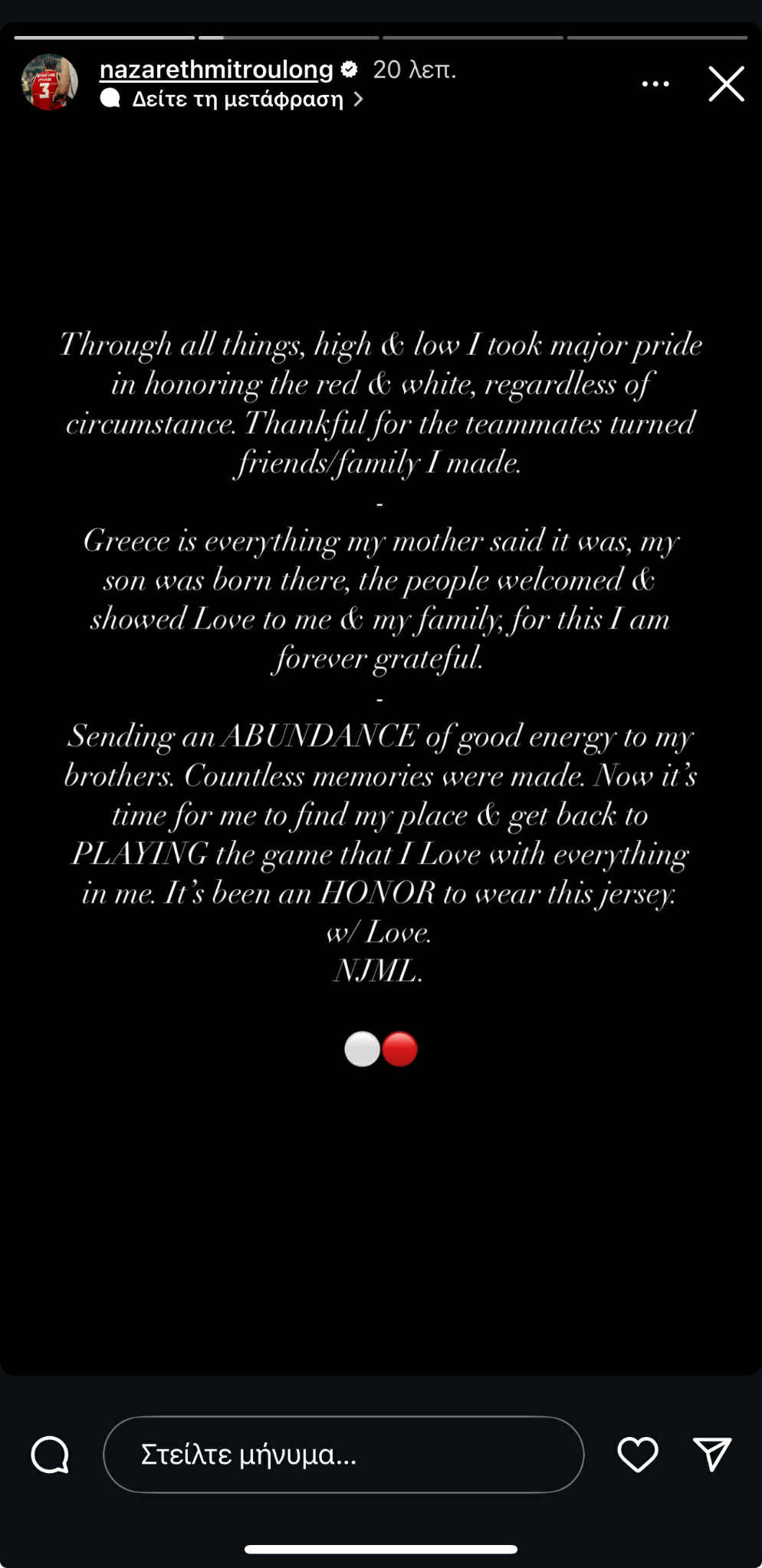 «Μέσα από όλα, στα εύκολα και στα δύσκολα, ένιωσα τεράστια περηφάνια που τίμησα τα ερυθρόλευκα, ανεξαρτήτως συνθηκών. Είμαι ευγνώμων για τους συμπαίκτες που έγιναν φίλοι και οικογένεια.