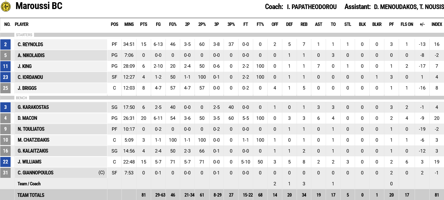 Ξεχώρισαν: 15 πόντους σημείωσε ο Βεζένκοβ, 14 ο πολύ καλός Γουόρντ, ενώ από 12 είχαν οι Ντόρσεϊ και Νιλικίνα, με τον Γάλλο γκαρντ να έχει και τρία ριμπάουντ με τέσσερις ασίστ. Για το Μαρούσι, από 15 πόντους είχαν οι Ρέινολντς και Γουίλιαμς.