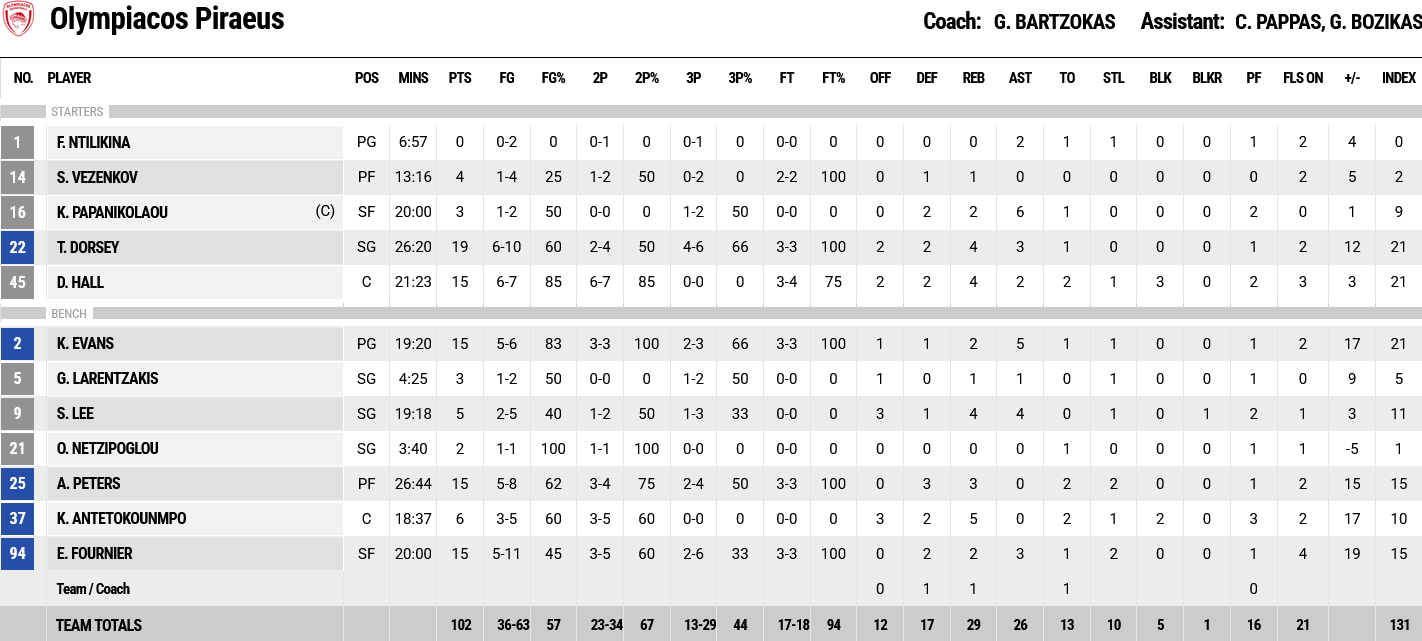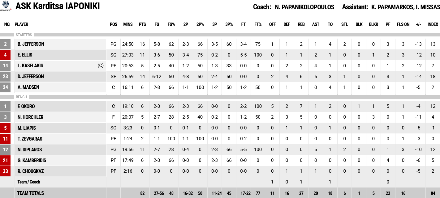 Ξεχώρισαν: 19 πόντους με 4/6 τρίποντα είχε ο Ντόρσεϊ, με τους Πίτερς, Φουρνιέ και Χολ να ακολουθούν με 15. Για την Καρδίτσα, Μπράντον και Ντέμιεν Τζέφερσον είχαν 16 και 14 πόντους αντίστοιχα.