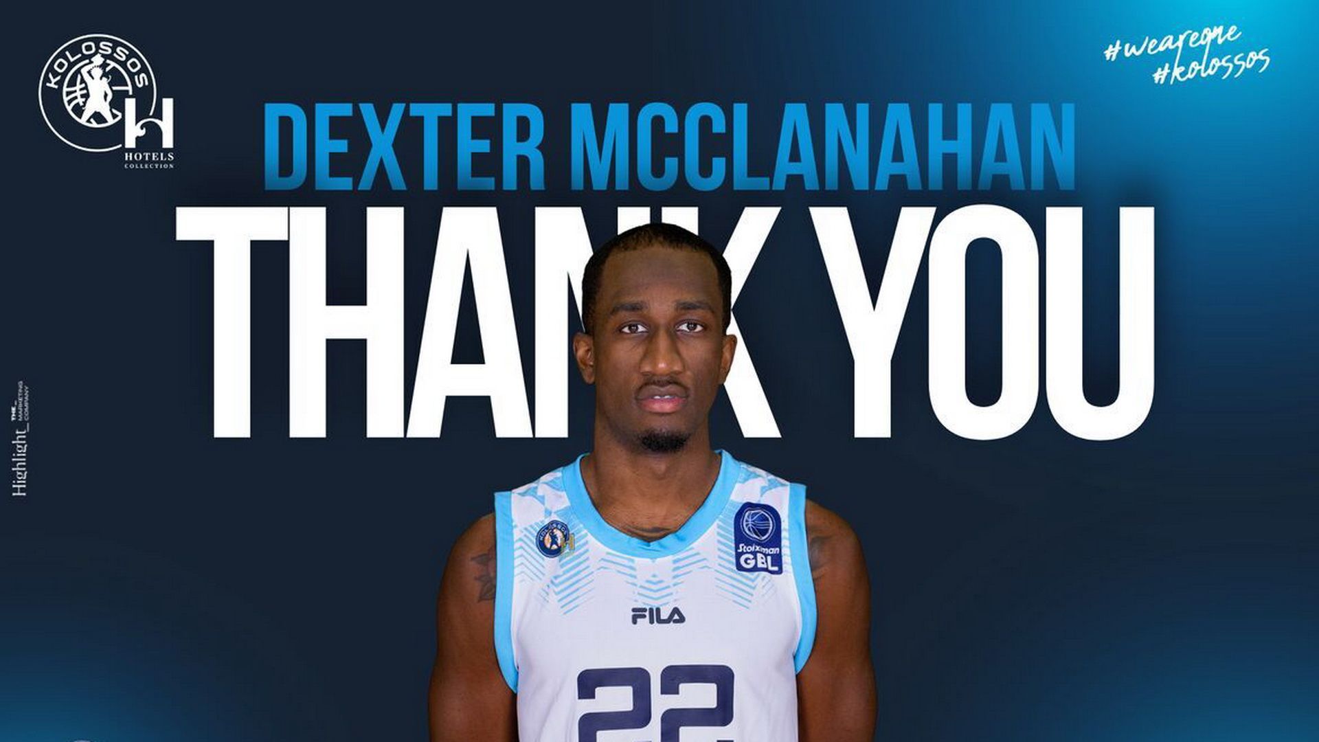 Η ΚΑΕ Κολοσσός H Hotels Collection ανακοινώνει τη λύση της συνεργασίας της με τον Ντέξτερ ΜακΚλάναχαν. Ευχαριστούμε τον Ντέξτερ για την προσφορά του στην ομάδα μας και του ευχόμαστε καλή συνέχεια στην καριέρα του.