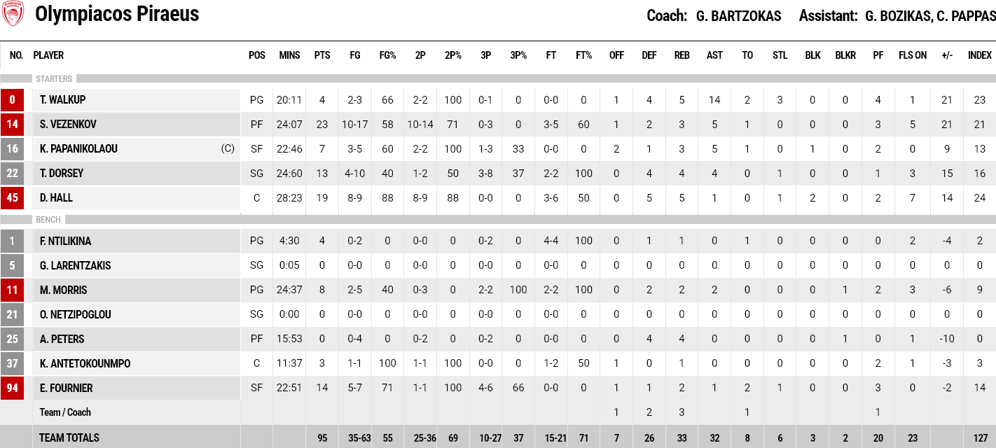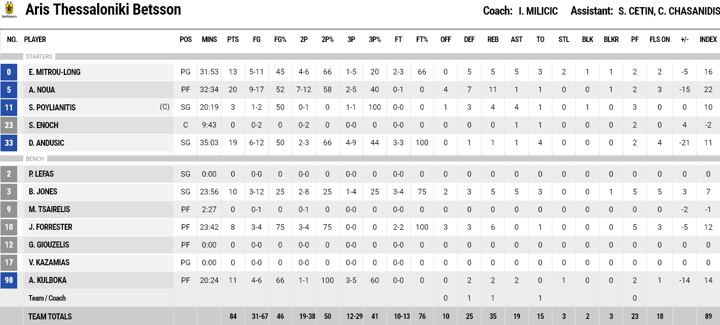Ξεχώρισαν: Εκκωφαντικός ο Χολ με 19 πόντους και 8/9 δίποντα, καρφώνοντας με μανία σε κάθε ευκαιρία το καλάθι του Άρη. 13 πόντους είχε ο Ντόρσεϊ, ενώ ο Γουόκαπ είχε 4 πόντους αλλά και 14 ασίστ. Για τον Άρη, εξαιρετικοί οι Νουά και Άντζουσιτς, με 20 και 19 πόντους αντίστοιχα, με τον πρώτο να έχει και 11 ριμπάουντ, ενώ 13 πόντους είχε ο Μήτρου – Λονγκ.