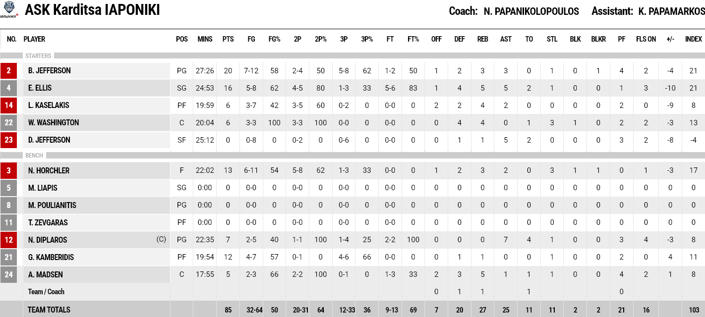 Ξεχώρισαν: Πολύ καλός ο Σορτς, με 15 πόντους και έξι ασίστ, ενώ ο Χουάντσο είχε εννιά πόντους και 10 ριμπάουντ. Για την Καρδίτσα ο Μπράντον Τζέφερσον είχε 20 πόντους, ο Έλις 16 και οι Χόρχλερ και Καμπερίδης από 16 και 15 πόντους αντίστοιχα.