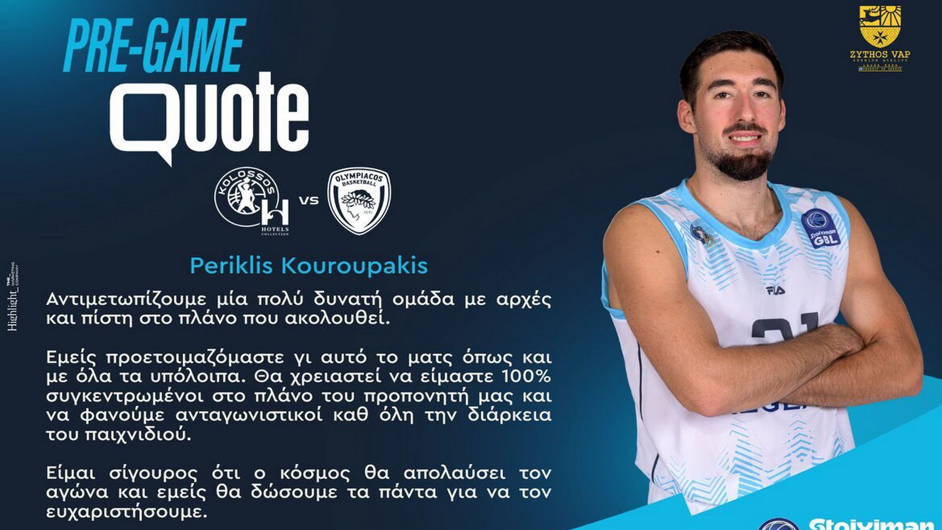 Ο Κολοσσός υποδέχεται τον Ολυμπιακό (25/1, 13:00), με τον Περικλή Κουρουπάκη, με δηλώσεις του στην επίσημη ιστοσελίδα της ομάδας, να αναφέρεται στο παιχνίδι απέναντι στους πρωταθλητές.