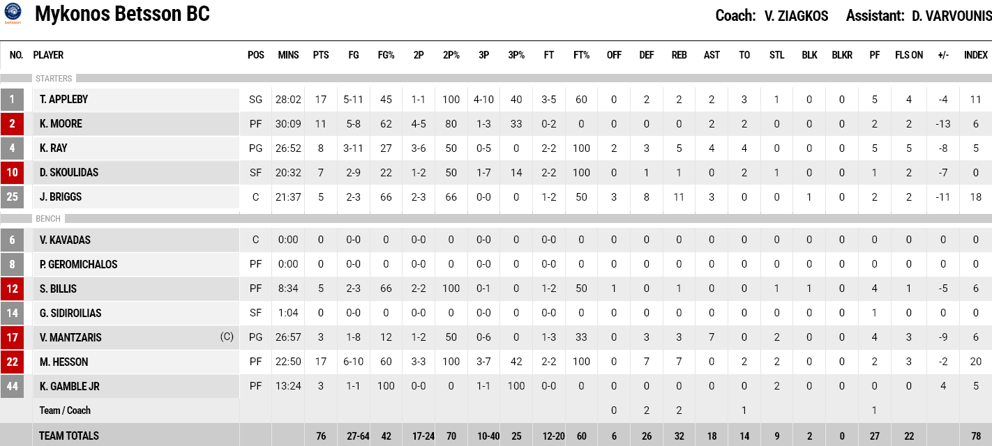 Ξεχώρισαν: 19 πόντους πέτυχε ο Κρούζερ, ενώ «double – double» έκανε και ο Τέιλορ, με 17 πόντους και 10 ασίστ. Για την Μύκονο, Χέσον και Άπλμπι είχαν από 17 πόντους, με τον Μουρ να προσθέτει 11.