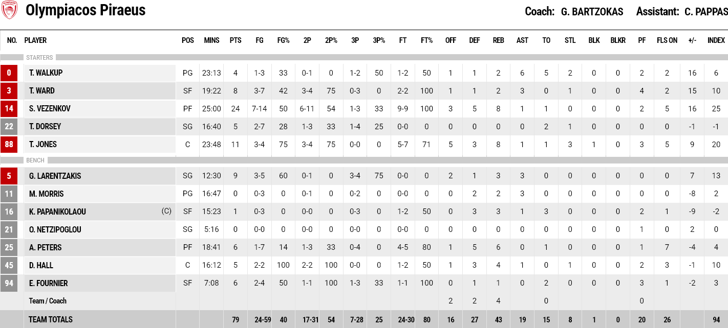 Σε ένα παιχνίδι με αρκετή ένταση, όπως φάνηκε από την αποβολή Φουρνιέ, οι «κυανέρυθροι» έβαλαν πολύ δύσκολα στους πρωταθλητές για 35’ (68-67), όμως στο φινάλε μίλησε η εμπειρία των «ερυθρόλευκων», που έφτασαν στην νίκη με 79-71 και παρέμειναν αήττητοι στην κορυφή της GBL για ακόμα μία εβδομάδα. Εξαιρετικός με 24 πόντους στο comeback του ο Βεζένκοβ.