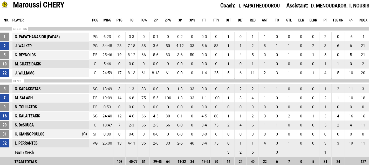 Ξεχώρισαν: «Διπλός» ο Γουίλιαμς με 17 πόντους και 11 ριμπάουντ, με τον Ρέινολντς να προσθέτει 19 πόντους. Για τον Κολοσσό, 24 πόντους και 10 ριμπάουντ είχε ο Γκαλβανίνι και 19 πόντους ο Μακ.