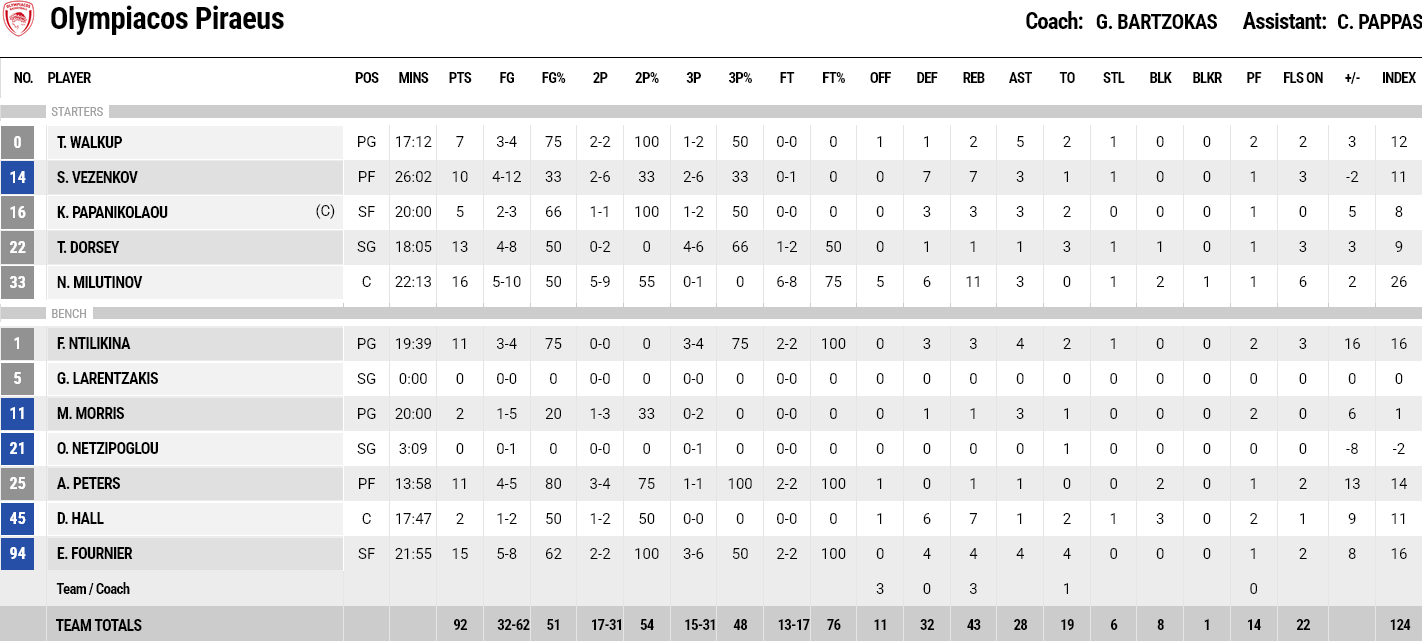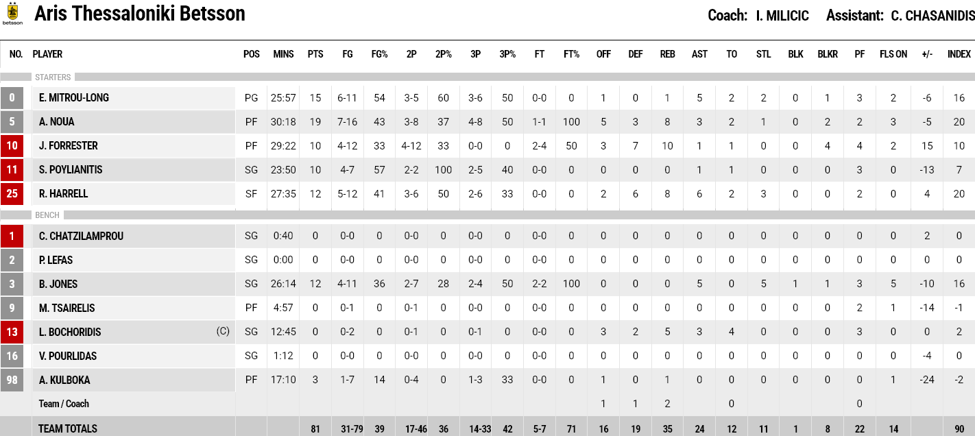 Ξεχώρισαν: 15 πόντους σημείωσε ο Εβάν Φουρνιέ, με τον Ντόρσεϊ να ακολουθεί με 13 και τους Νιλικινά και Πίτερς από 11, ενώ ο Βεζένκοβ πρόσθεσε 10 πόντους. Για τον Άρη, 19 πόντους είχε ο Νουά, 15 ο Μήτρου Λονγκ, 12 ο Χάρελ, ενώ ο Φόρεστερ έκανε double – double με 10 πόντους και ισάριθμα ριμπάουντ.