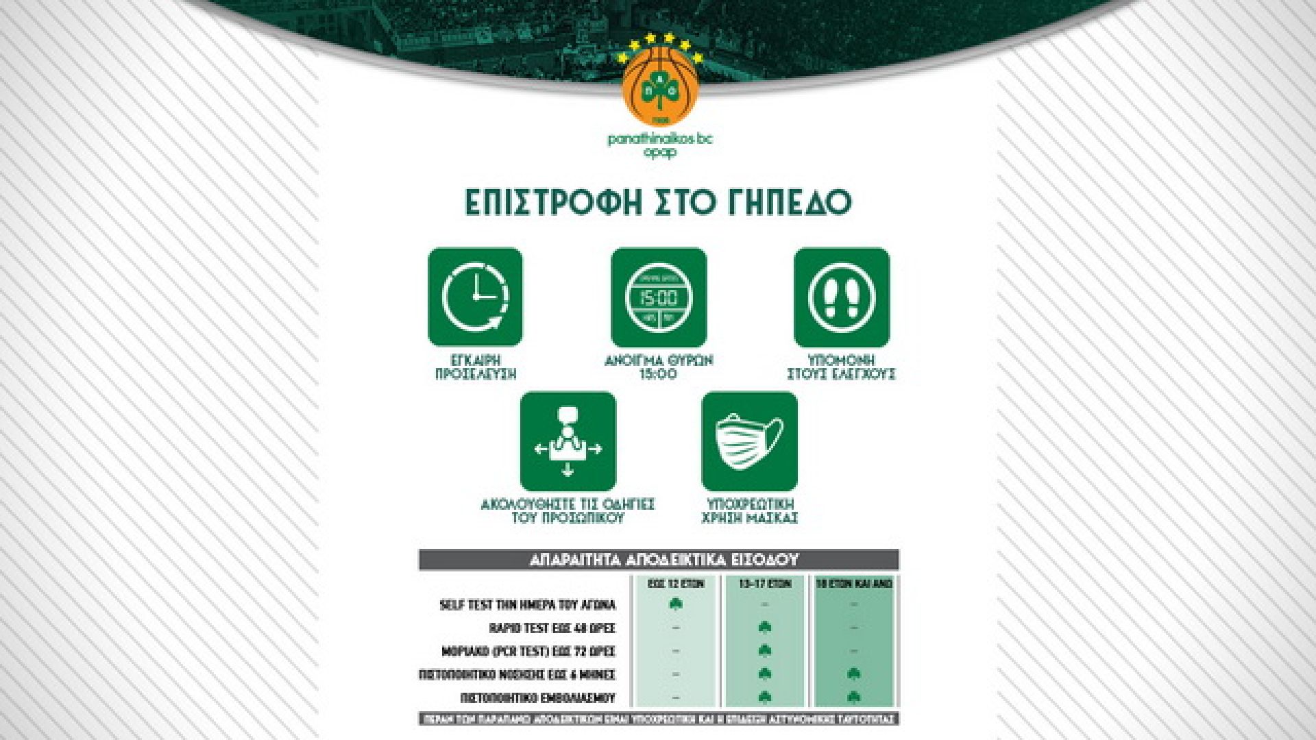 - Οι κάτοχοι κάρτας διαρκείας ή απλού εισιτηρίου οφείλουν να προσέρχονται στο γήπεδο με το πιστοποιητικό εμβολιασμού ή το πιστοποιητικό νόσησης κατά τους έξι τελευταίους μήνες, το οποίο θα επιδεικνύουν στους προελέγχους, μαζί με το έγγραφο ταυτοποίησης (ταυτότητα, διαβατήριο ή άδεια παραμονής).