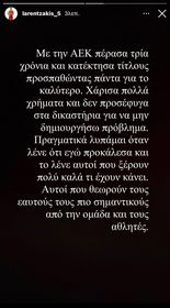 Το πρωί της Κυριακής (30/1), τον λόγο πήρε ο ίδιος ο Γιαννούλης Λαρεντζάκης, ο οποίος, με ανάρτηση του στα social media, έδωσε την δική του εκδοχή, τονίζοντας πως παράγοντας της πρώην ομάδας του, μαζί με οπαδό της ΑΕΚ, τον έβρισαν, χωρίς τον ίδιο να απαντήσει, μέχρι την στιγμή που ο τελευταίος αναφέρθηκε με χυδαίο τρόπο στην μητέρα του.