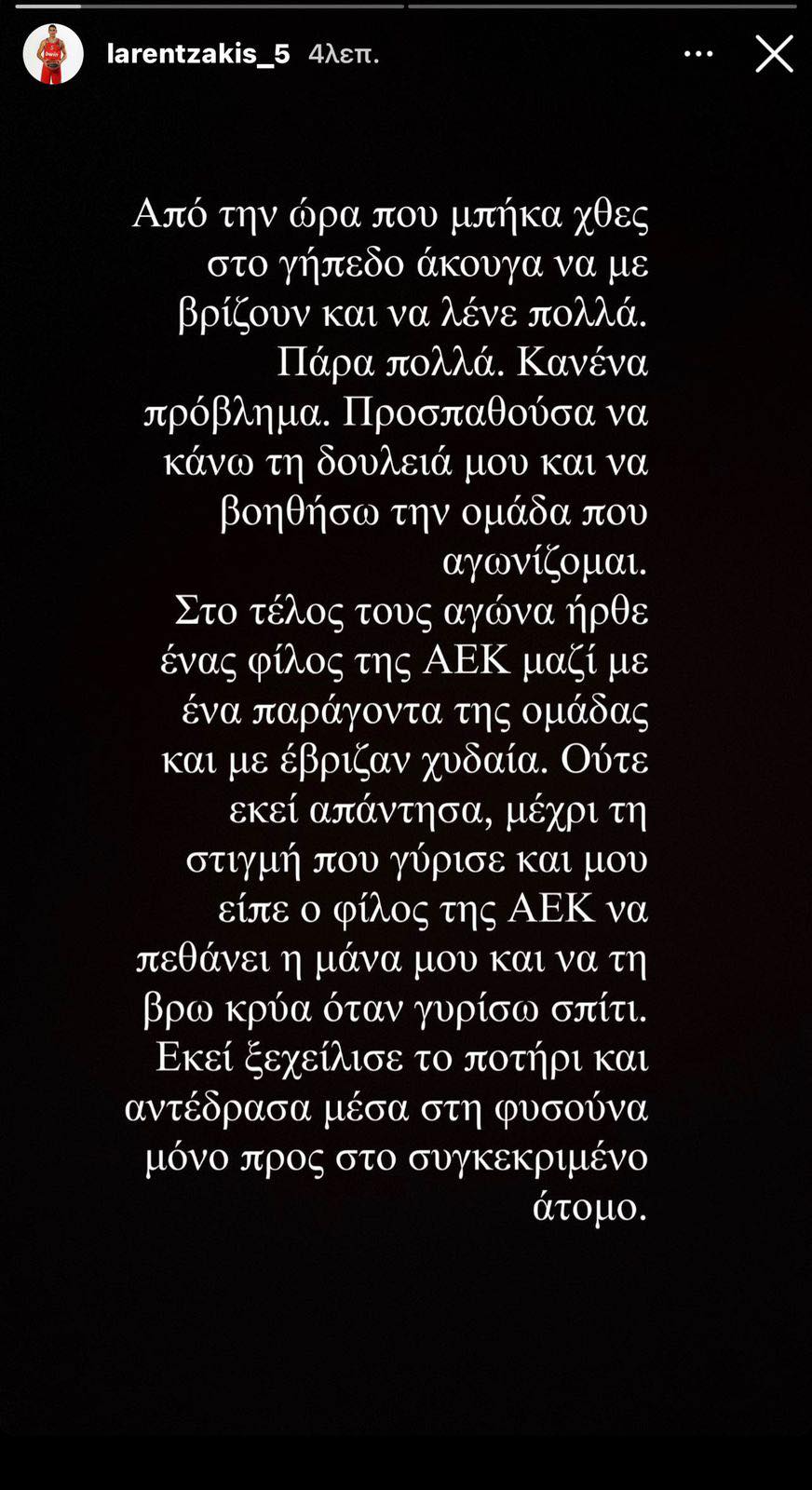 Από την ώρα που μπήκα χτες στο γήπεδο, άκουγα να με βρίζουν και να λένε πολλά. Πάρα πολλά. Κανένα πρόβλημα. Προσπαθούσα να κάνω την δουλειά μου και να βοηθήσω την ομάδα που αγωνίζομαι. Στο τέλος του αγώνα, ήρθε ένας φίλος της ΑΕΚ, μαζί με έναν παράγοντα της ομάδας και με έβριζαν χυδαία. Ούτε και εκεί απάντησα, μέχρι την στιγμή που γύρισε και μου είπε ο φίλος της ΑΕΚ να πεθάνει η μάνα μου και να την βρω κρύα όταν γυρίσω σπίτι. Εκεί ξεχείλισε το ποτήρι και αντέδρασα μέσα στην φυσούνα μόνο προς το συγκεκριμένο άτομο», αναφέρει χαρακτηριστικά ο Λαρεντζάκης.
