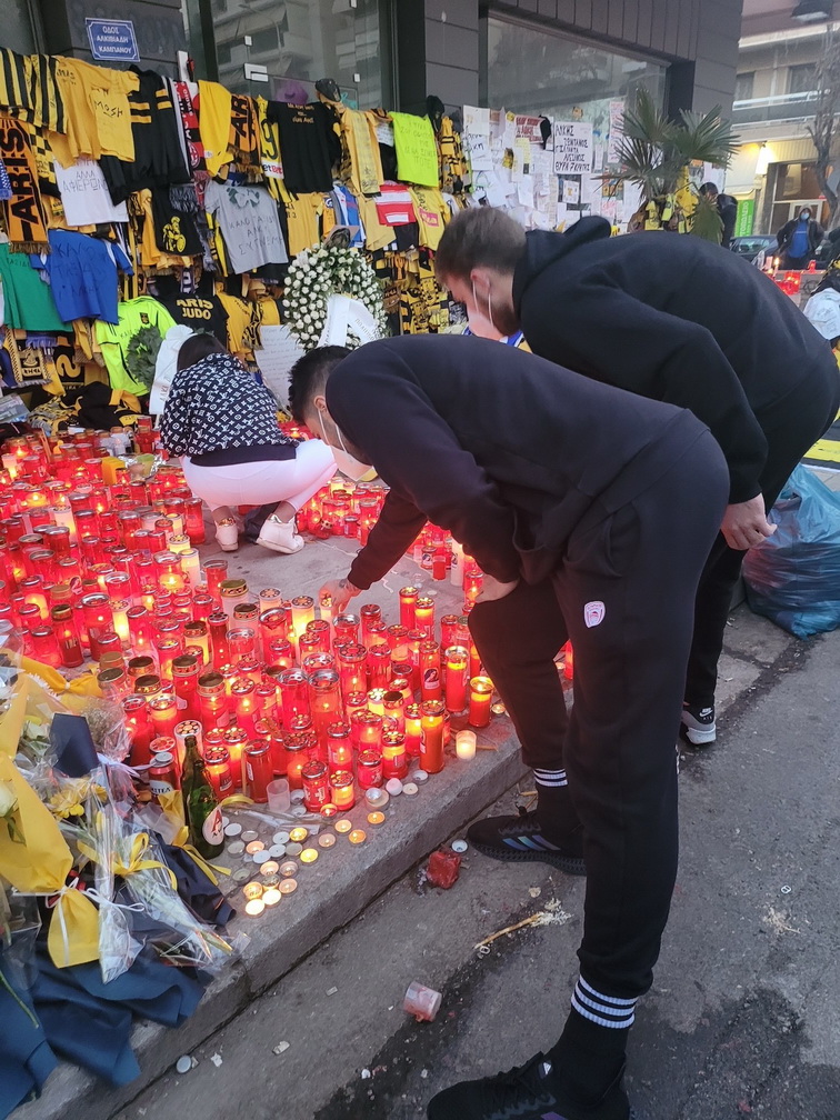 Το απόγευμα της Κυριακής (06/02) αντιπροσωπεία της ΚΑΕ Ολυμπιακός αποτελούμενη από τον αρχηγό, Γιώργο Πρίντεζη, τον Κώστα Παπανικολάου, τον Κώστα Σλούκα, τον Σάσα Βεζένκοφ και τον Sports Director, Χρήστο Μπαφέ, βρέθηκε στο σημείο που έχασε τη ζωή του ο Άλκης και απέτισε φόρο τιμής στον αδικοχαμένο 19χρονο, αφήνοντας μια υπογεγραμμένη «ερυθρόλευκη» φανέλα με το μήνυμα «Ποτέ ξανά, Άλκης», τα παπούτσια του Κώστα Παπανικολάου, λουλούδια και αναμένα κεριά.