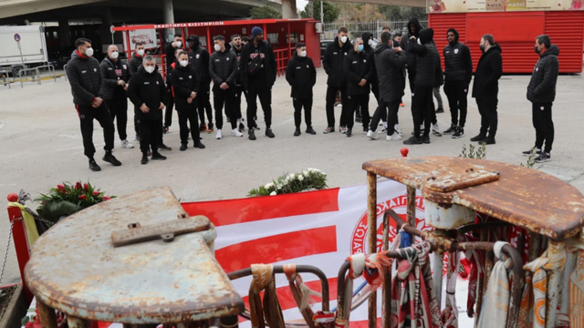 Ο αρχηγός των Πειραιωτών, Γιώργος Πρίντεζης, εναπόθεσε στεφάνι, ενώ όλα τα μέλη της ομάδας άφησαν από ένα κόκκινο τριαντάφυλλο.