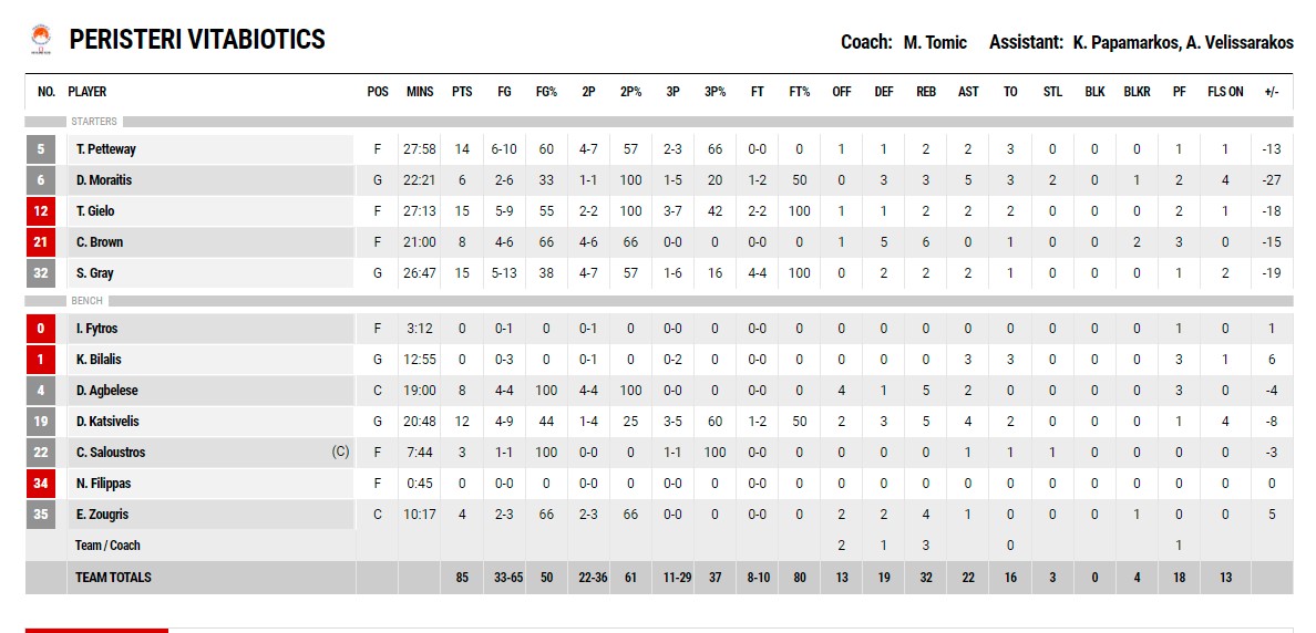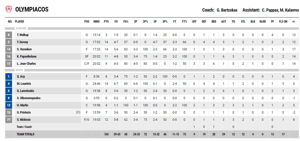 Ξεχώρισαν: Για τον Ολυμπιακό οι Ντόρσεϊ και Βεζένκοφ, που πέτυχαν αμφότεροι από 14 πόντους. Για το Περιστέρι, πρώτος σκόρερ ο Γκίελο με 15 πόντους.