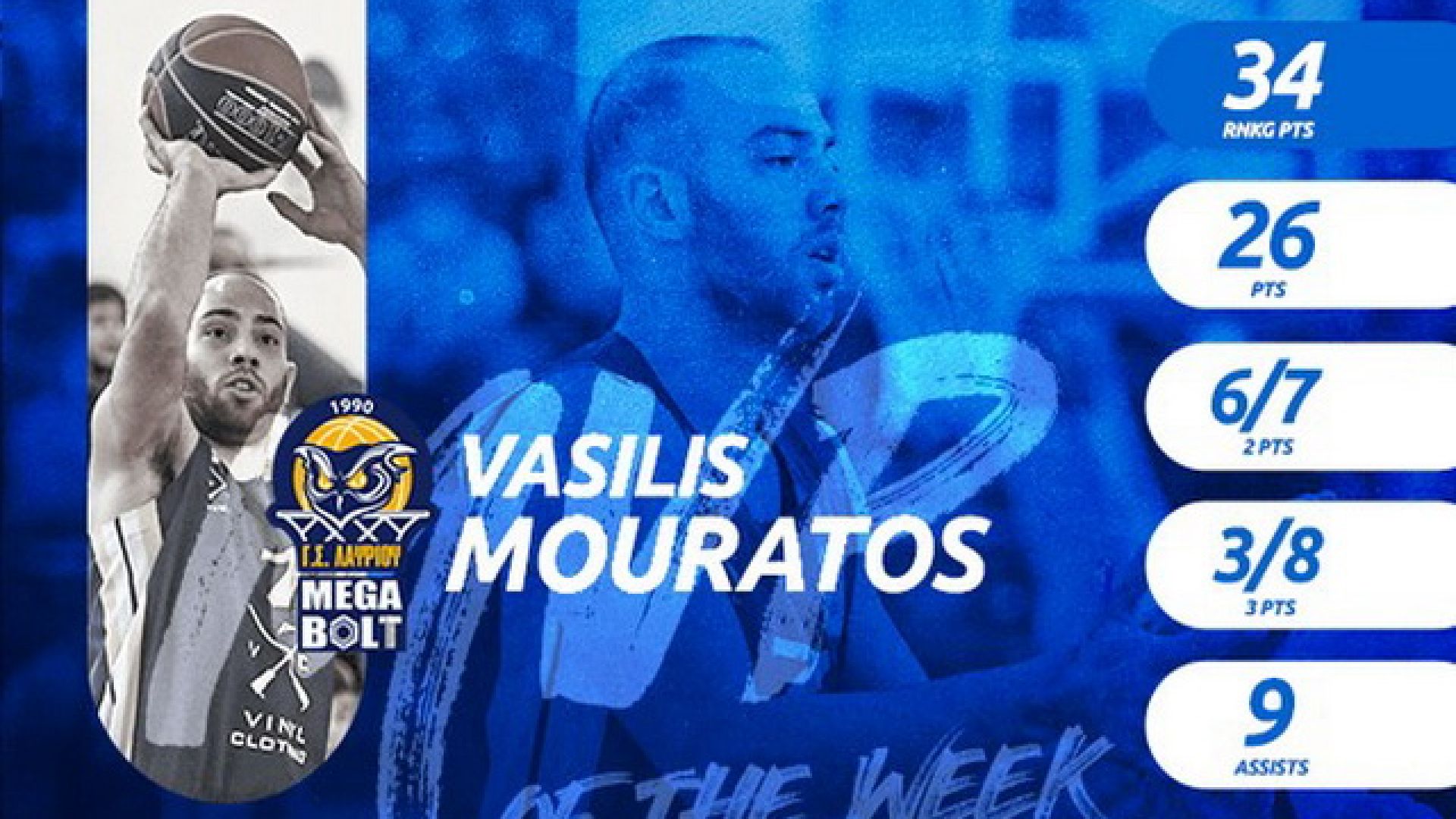 Ο Βασίλης Μουράτος έκανε ρεκόρ καριέρας στην Stoiximan Basket League πόντων και ranking στην εκτός έδρας νίκη του Λαυρίου Megabolt επί του Ιωνικού και σαν επίστεγασμα της εντυπωσιακής εμφάνισης του ήρθε η ανάδειξη του σε Stoiximan MVP of the Week!
