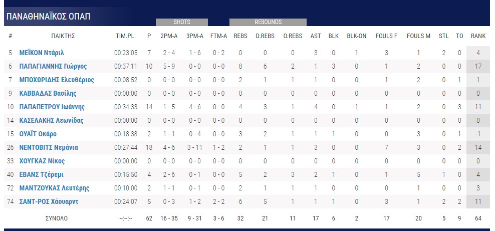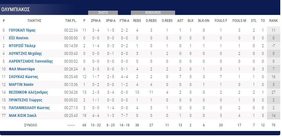 Ξεχώρισαν: Για τον Ολυμπιακό οι Βεζένκοφ (13 π – 15 ριμπ.), Σλούκας (15 π. – 7 ασίστ) και Γουόκαπ (11 π.), ο οποίος πέρασε… χειροπέδες στο τέλος στο Νέντοβιτς. Για το Τριφύλλι, καλύτεροι ήταν οι Παπαγιάννης (10 π. – 8 ριμπ.) και Νέντοβιτς με 18 π.