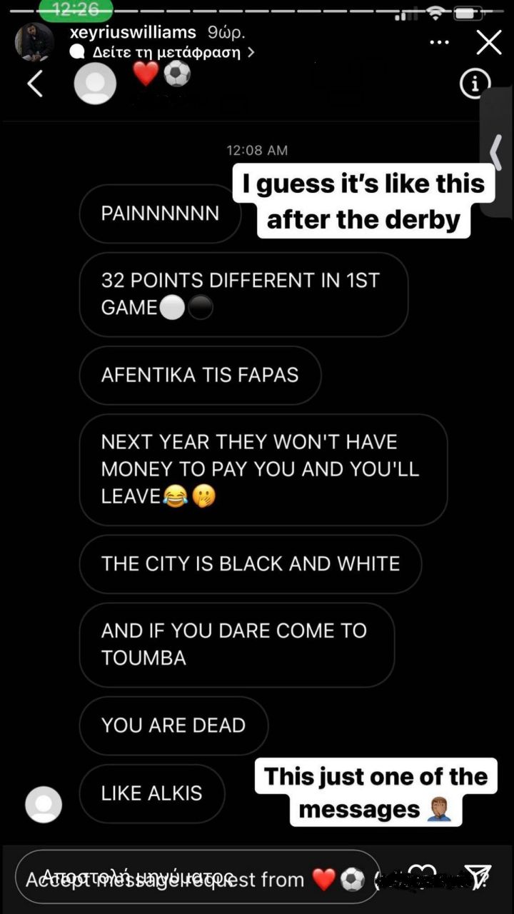 Το σοκαριστικό μήνυμα για την ζωή του, που δέχθηκε στο Instagram ο Ζίριους Γουίλιαμς του Άρη, προκάλεσε την αντίδραση των «κιτρινόμαυρων», οι οποίοι ενημέρωσαν την δίωξη ηλεκτρονικού εγκλήματος, προκειμένου να βρεθεί ο άνθρωπος που το έστειλε.