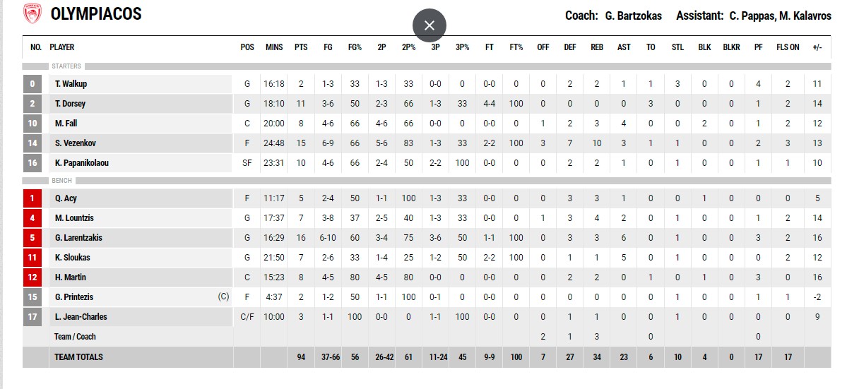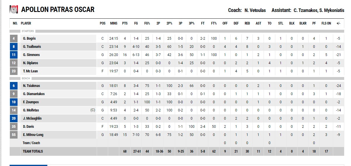 Ξεχώρισαν: Για τον Απόλλων ο Σίμονς με 16 πόντους και για τον Ολυμπιακό ο Λαρεντζάκης με 16 πόντους.