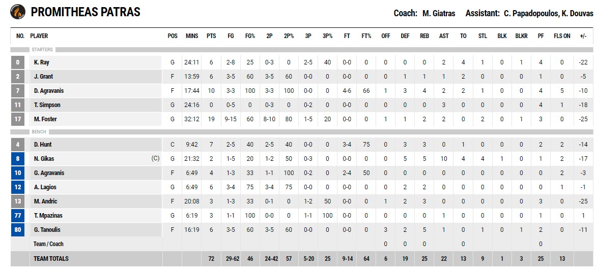 Ξεχώρισαν: Για τον Προμηθέα ο Φόστερ που πέτυχε 19π. με 9/15 δίποντα και για τον Ολυμπιακό, ο εξαιρετικός Μάρτιν με 17π. (8/9διπ.) και 6ριμπ.