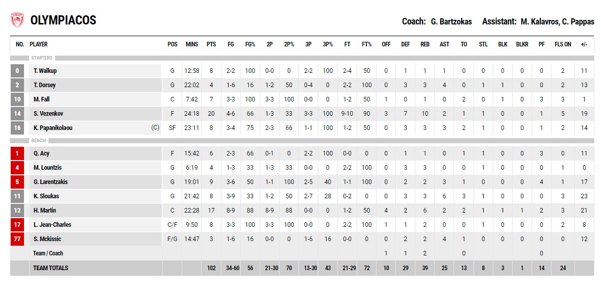 Οι ερυθρόλευκοι, αφού ξεπέρασαν την αρχική διάθεση των γηπεδούχων να πιέσουν ψηλά, πήραν διψήφιο προβάδισμα στα μέσα της δεύτερης περιόδου και στη συνέχεια δεν δυσκολεύτηκαν να φτάσουν στην επικράτηση. Αξίζει να σημειωθεί ότι σκόραραν όλοι οι παίκτες του Ολυμπιακού.