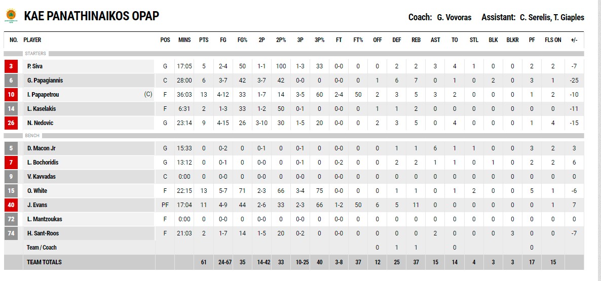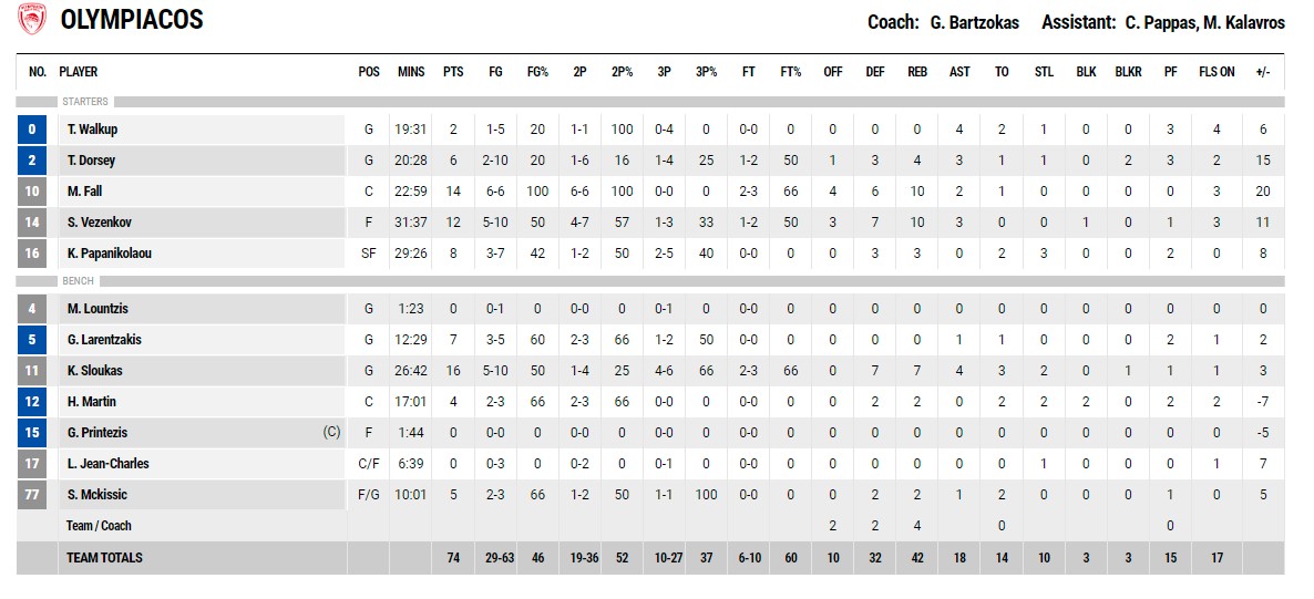 Ξεχώρισαν: Οι Φαλ (14π. - 10ριμπ.) και Βεζένκοβ (12π. - 10ριμπ.) για τον Ολυμπιακό και ο Γουάιτ (13π.) για τον Παναθηναϊκό.