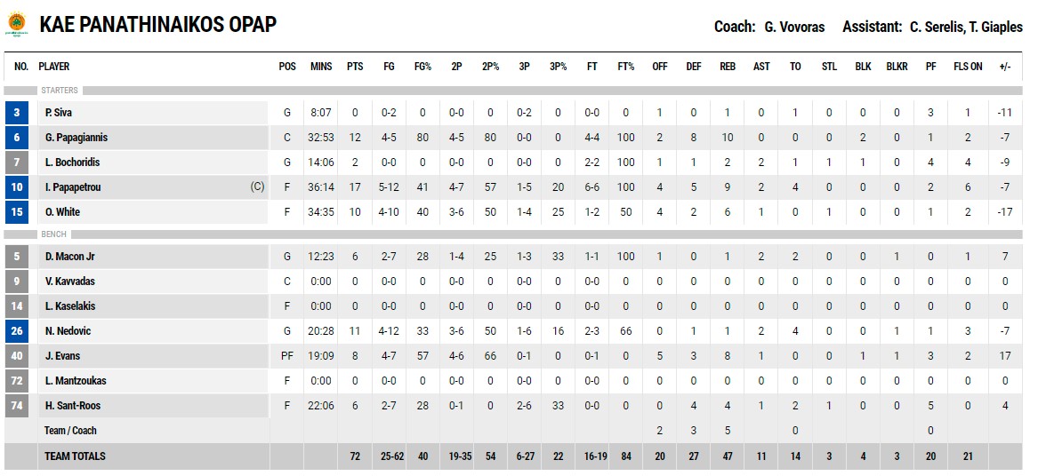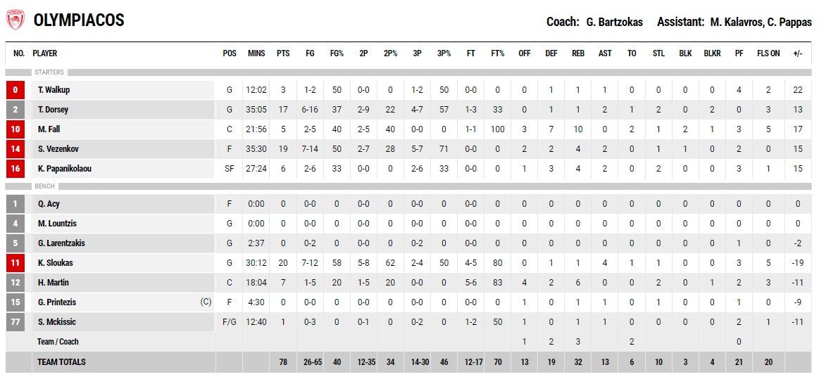 Ξεχώρισαν: Ο σούπερ Σλούκας με 20π και ο Βεζένκοβ με 19π. Για το τριφύλλι, ήταν καλύτερος ο Παπαπέτρου με 17 π.
