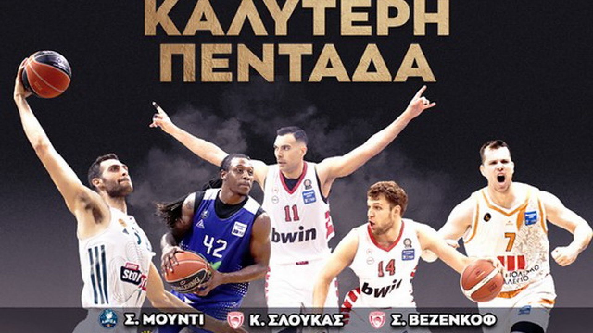 Ο Στέφαν Μούντι της Λάρισας, ο Κώστας Σλούκας και ο Σάσα Βεζένκοφ του Ολυμπιακού, ο Δημήτρης Αγραβάνης του Προμηθέα Πάτρας και ο Γιώργος Παπαγιάννης του Παναθηναϊκού ΟΠΑΠ αποτελούν την ιδανική πεντάδα της Stoiximan Basket League 2021-22.