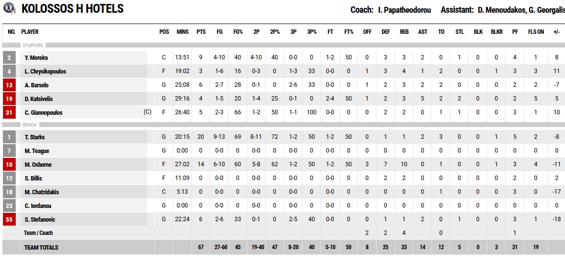 Ξεχώρισαν: Σταρκς (20π.) και Όσμπορν από τον Κολοσσό Ρόδου έδειξαν ότι μπορεί να είναι από τους παίκτες που θα κλέψουν την παράσταση. Από την άλλη τα πρώτα δείγματα γραφής του Πονίτκα πιστοποίησαν για μία ακόμη φορά την ποιότητα του παίκτη, όπως και ο Γκριγκόνις που επέστρεψε από τον τραυματισμό του και ο Γουίλιαμς.