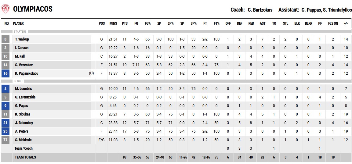 Η μεγαλύτερη διαφορά: Ο Ολυμπιακός έφτασε στο +28 με τον Λούντζη να γράφει το 79-51 (32'30''). Ήταν και η διαφορά με την οποία έκλεισε το παιχνίδι (93-65)