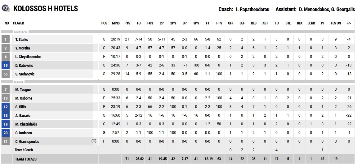 *Ο Κολοσσός αγωνίστηκε χωρίς τους Χάρη Γιαννόπουλος και Μαρκίς Τιγκ.