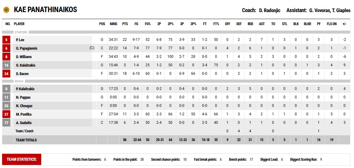 *Ο Παναθηναϊκός παρατάχθηκε με 10 παίκτες. Αγωνίστηκε χωρίς τον Γκριγκόνις (εκτός εξάδας ξένων στο ελληνικό πρωτάθλημα) και τους τραυματίες Μαντζούκα, Μποχωρίδη, Μαντζούκα, ενώ οι «μικροί» Σαμοντούροβ και Αβδάλας βρίσκονται στο Μόναχο όπου παίρνουν μέρος την ομάδα U18 των «πράσινων».