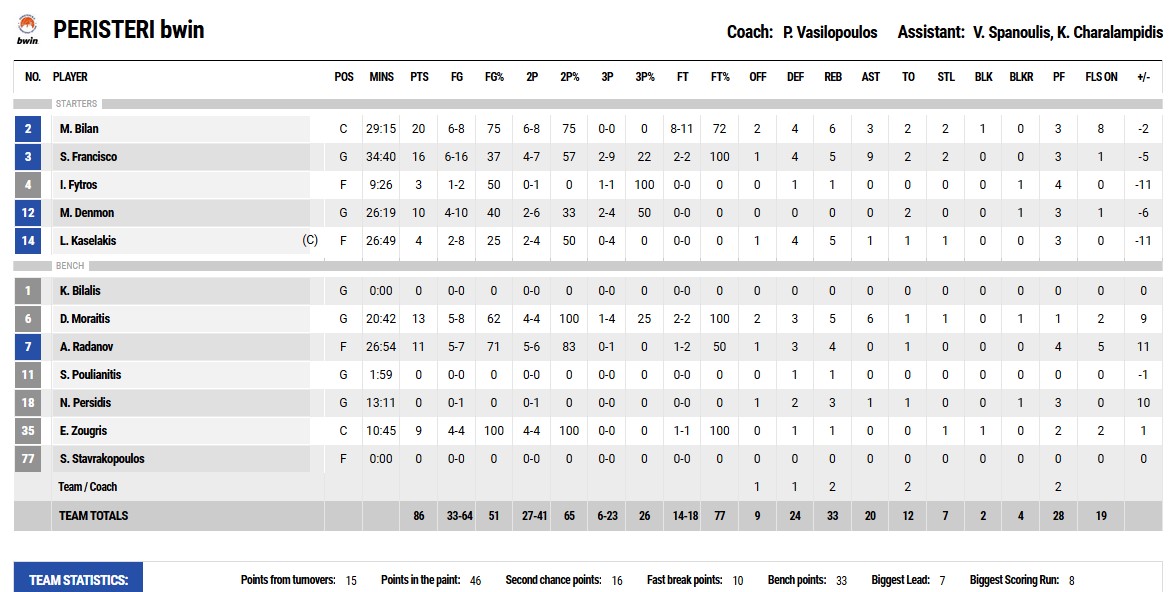 Ξεχώρισαν: Ζούγρης, Μωραϊτης, Μπίλαν, Ραντάνοφ για το Περιστέρι, Λούντζης, Παπανικολάου, Γουόκαπ για τον Ολυμπιακό