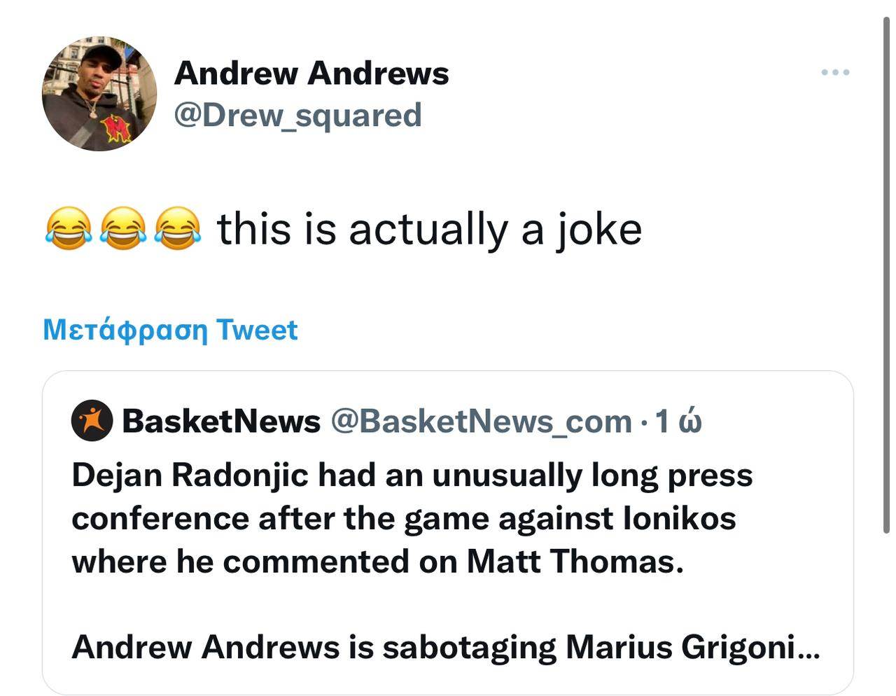 Φυσικά, η αντίδραση του Άντριους στο... τιτίβισμα του "basketnews' ήταν θέμα χρόνου, με τον Αμερικανό να αναφέρει χαρακτηριστικά «Είναι αστείο», συνοδευόμενη την ανάρτηση του με emoticons… γέλιου.