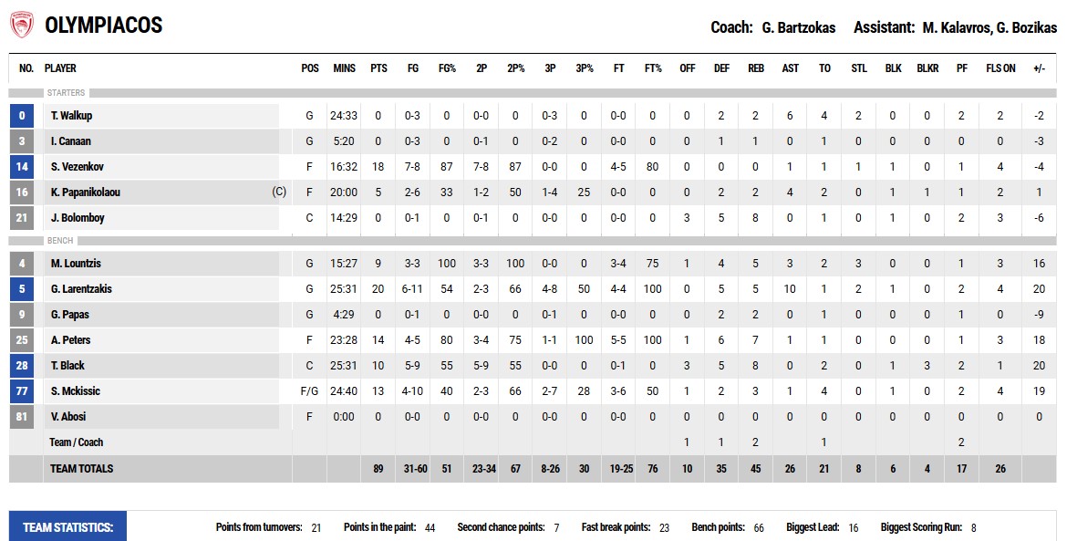 *Eκτός αποστολής έμειναν οι Ίσμαελ Σανόγκο, Βασίλης Καββαδάς και Ρισόντ Πακ, οι οποίοι συνεχίζουν τη θεραπεία τους στη Θεσσαλονίκη. O Ολυμπιακός αγωνίστηκε χωρίς τον τραυματία Κώστα Σλούκα και τον Μουστάφα Φαλ.