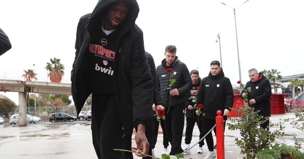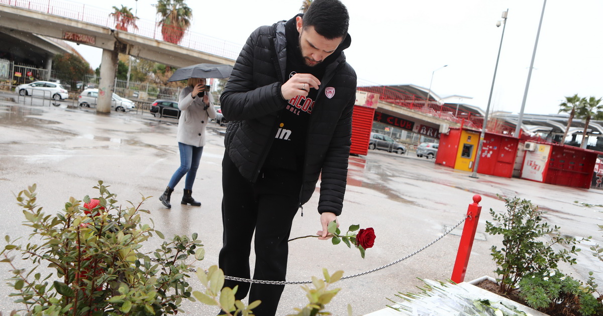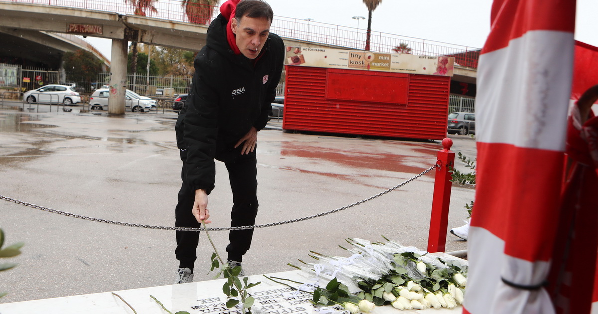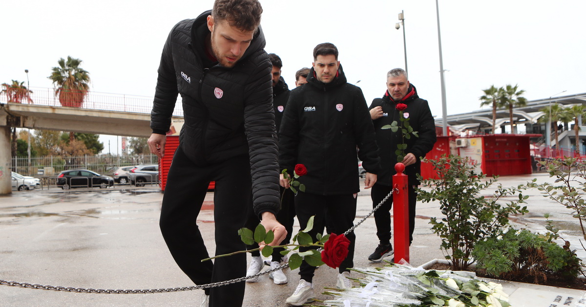 Συγκεκριμένα, η αποστολή των «ερυθρόλευκων», πριν την αναχώρηση της για το Λαύριο και το παιχνίδι απέναντι στην τοπική ομάδα (15:45), πέρασε από το Στάδιο Καραϊσκάκη και το μνημείο για τα θύματα της Θύρας 7, με τον Γιώργο Μπαρτζώκα και τους παίκτες του να αφήνουν από ένα λουλούδι.