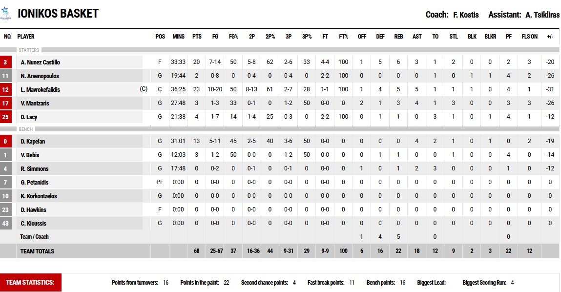 Η μεγαλύτερη διαφορά: +34 (78-44, 34') για τον Ολυμπιακό. Ο Ιωνικός Ν. δεν προηγήθηκε σε κανένα σημείο της αναμέτρησης