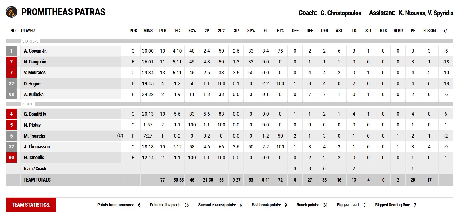 Η μεγαλύτερη διαφορά: +15 για τον Ολυμπιακό (22-7, 6’). +3 για τον Προμηθέα Πάτρας (0-3, 1’)