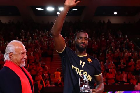 Ο κορυφαίος αμυντικός της φετινής Euroleague, Άλφα Ντιαλ΄ο, παρέλαβε το σχετικό βραβείο πριν το τζάμπολ του κρίσιμου αγώνα play-in ανάμεσα σε Μονακό και Μπαρτσελόνα.