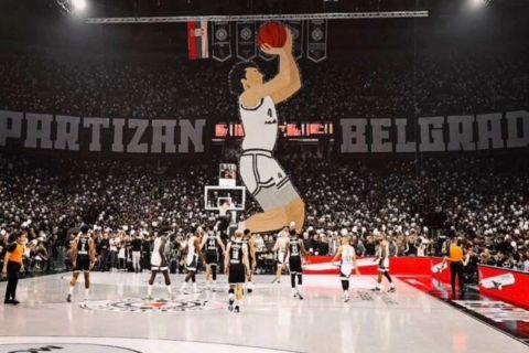 Οι οπαδοί της Παρτιζάν σήκωσαν ένα απίθανο κορεό πριν από το τζάμπολ του αγώνα με τη Φενέρμπαχτσε που απεικόνιζε το μεγάλο τρίποντο του Σάσα Τζόρτζεβιτς στον τελικό με την Μπανταλόνα.