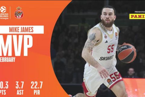 Πολυτιμότερος αθλητής της Euroleague ανάμεσα σε συμπαίκτες και αντιπάλους αναδείχθηκε ο Μάικ Τζέιμς για τον μήνα Φεβρουάριο, με τον Αμερικανό να συνδυάζει την καλή απόδοση με νικηφόρα αποτελέσματα.