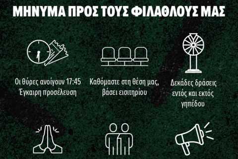 Το δικό της μήνυμα στους οπαδούς του Παναθηναϊκού ενόψει του ντέρμπι με τον Ολυμπιακό για τη 15η αγωνιστική της Basket League έστειλε η πράσινη ΚΑΕ, με τους ιθύνοντες των γηπεδούχων να ενημερώνουν για το άνοιγμα των θυρών του ΟΑΚΑ στις 17:45, ήτοι 2μιση ώρες πριν την έναρξη του αγώνα.