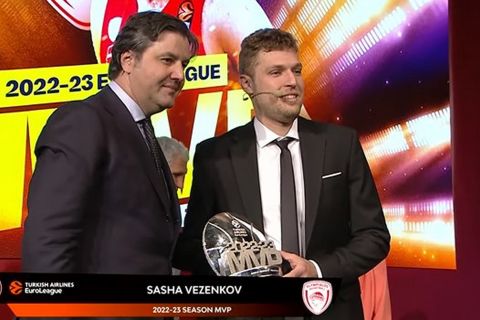 Ήταν δίκαιο και έγινε πράξη. Ο Σάσα Βεζένκοβ αναδείχθηκε ο πολυτιμότερος παίκτης της Euroleague για την σεζόν 2022-23, με τον φόργουορντ του Ολυμπιακού να παραλαμβάνει το βραβείο του από τον ισχυρό άνδρα της Euroleague, Ντέγιαν Μποντιρόγκα.
